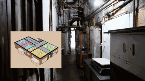 2)建筑的一层,商铺、住家混杂,餐饮、理发、颜料商店、烟草店等四散分布,整个空间年久失修,显得比较破旧。