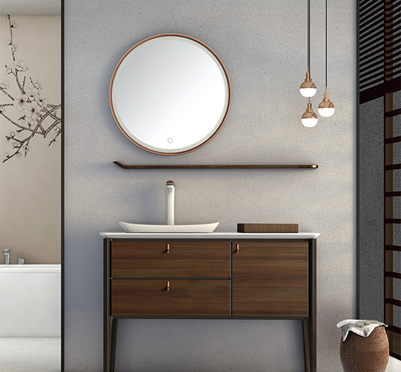 收纳柜上镶着圆形的玫瑰金金属镜框,在这微妙的空间结构中,展现着天圆地方的中式美,这种对禅文化的抽象转译,搭配上LED触感镜灯,意境与科技感并存。